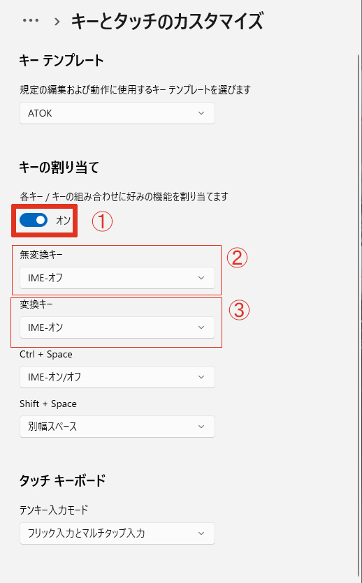 そして「無変換キー」を「IME – オフ」(画像②)に、「変換キー」を「IME – オン」(画像③)にするだけで完了です。